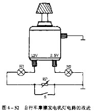 改进方法见图。将原12V灯泡换成3.8V,0.3A的电珠,再串入一只100Ω,5W的绕线可变电阻器RP,并在电阻器的两端并联一只开关S。适当调节RP,使自行车走下坡路时,加在H1两端的电压在3.8~4V范围内,这样不会烧灯泡。开关S装在自行车手柄旁,以便自行车高速时随手将S关断,让H1在额定电压下工作;而自行车上坡或低速行驶时,将S闭合,使RP被短接,确保H1两端在额定电压范围工作,有足够搞的电压加在H1上,灯泡正常发光。