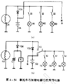 摩托车的喇叭、转向灯、刹车灯一般是由继电器GB供电,而大灯H1、尾灯H2、夜行灯H3等,均由磁电机GS供电,参见图4-54(a)。所以,在摩托车发动机停转时这些灯均熄灭,夜间停车停车时就无停车标志灯。