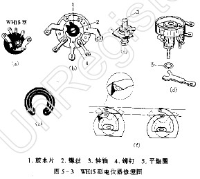 要想修理碳膜片磨损,必须把电位器拆开。图5-3(b)、(c)、(d)是WH15型小型电位器的拆开图。在拆开过程中,最好把电位器开关在断开时,胶木片与另一面上导电弹簧的位置看清楚,并做好记号,以便安装时恢复原状。