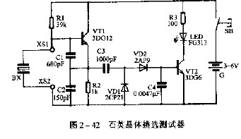 把待测石英晶管BX插入插座XS1、XS2,按下按钮SB,如果BX是好的,则由三极管VT1电容C1、C2等元器件构成的振荡器工作,振荡信号从VT1发射输出,经C3耦合到VD2进行检波、C4滤波,变成滞留信号电压,送至VT2基极,使三极管VT2获得正向偏置电压而导通,于是发光二极管LED发出红光,指示这只被测石英晶体是好的。若是LED不亮,则表明石英晶体是坏的。