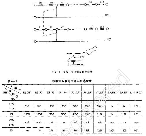 如果用双刀五掷波段开关改制双联电位器来调节音调,可用表阻值选配表。