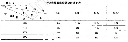 标为安装指数双联电位器时的电阻选配表,以供读者参考。表中。RP1、RP2阻值栏内,有的栏有两个数值,如4.7kΩ、5.1kΩ,这是指市售常见的电位器阻值,我们选配电阻时,应在这个值的范围以内。