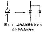 双向晶闸管损坏后的改用双向晶闸管亦叫双向可控硅。因使用不当或元件质量低劣而引起损坏时,其大部分某个半波可控部分失效,其等效电路如图所示,相当于一个正向单相晶闸管和一个反向二极管并联。因而可改作单向晶闸管使用。