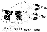 制作方法:取一块厚1.1mm左右的单面或双面敷铜板,参照图截成一个门形块,局中用刻刀将敷铜箔刻断剥去,再焊上带鳄鱼夹的短引线。使用时,把门形插销插入数字万用表的电容测量孔中,再用鳄鱼夹夹住待测电容器的引脚即可进行测量。这样,不论什么形状、多粗多细的电容器引脚,都可以靠地夹持住了。