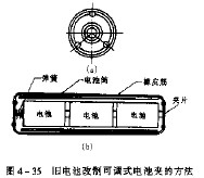 我们找两节废旧的电池(与需要卡夹电池同型号、同规格),将负级(俗称尾部)端的防漏碟片拆下,用铁钉如图4-35(a)所示扎出三只φ2.5mm左右的孔,要均匀分布,并将毛边挫掉,然后穿入橡皮筋,要求两个夹片的凸面朝一个方向。再在一只夹片上焊上一个铁丝(φ1.5mm左右)自制的弹簧,焊上黑线;在另一个夹片上焊上红线,这样,一只简易电池夹就做成了。由于橡皮筋有弹性,所以这个电池夹可装1~3节电池。如果还想多装几节电池,那么多用几根橡皮筋接起即可。因电池多了容易松脱,可参照本书介绍的“薄膜唱片改制电池筒”的方法制作一个电池筒。如找不到薄膜唱片,也可用厚一点的纸把电池卷起来,作一个简易的电池筒。