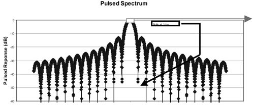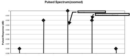 这些图形显示了 PRF为 1.69 kHz、脉冲宽度为 7 ?s(a)的信号的脉冲频谱,以及同一脉冲频谱放大到基频(图中心)(b)的图像。