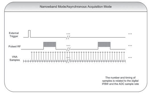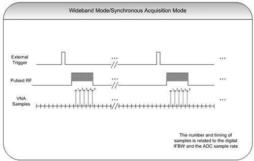 对于 VNA中的宽带检波,检波器会与被测脉冲流进行同步,只在脉冲处于“通”状态时获取数据。由于 VNA中的脉冲触发与 PRF同步,这种测量方法通常称为同步采集模式。