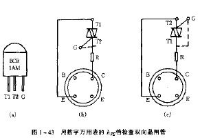 利用数字万用表的hFE插口,能很方便地检查出双向晶闸管的触发能力。方法见图。图为一只日本三菱公司制造的小型塑封双向晶闸管BCR1AM型的外形,有字的一面为正面,管脚从左至右以此为T1、T2、C。该管的正向平均电流IF=1A,不带散热器。取数字万用表(例如DT-830型)拨到“NPN”档,让双向晶闸管的G极开路,T2极经过限流电阻R(约300Ω)接“C”孔,T1极经过导线接至“E”孔。电阻R在这里的作用是防止hFE过载。电路如图所示,此时数字万用表显示值为“000”,表明双向晶闸管处于关断状态。然后用以根导线把G极与T2极短接,用“C”孔上的+2.8V作触发电压,显示数字立即由“000”跳变程“578”,说明双向晶闸管已经导通。再按图试验一次,显示值从“000”→“428.证明”双向晶闸管能在连个方向导通,质量是好的。