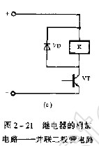 在晶体管或集成电力控制的需电器电路中,往往可以看到在继电器线圈两端并联了一只二极管,如图所示。这是由于当电流经需电器线圈的电流突然减少(截止)的瞬间。在它的两端会感应出一个电动势,它与电源电压叠加后加到控制继电器线圈的晶体管VT的e、c两极上,使发射结(e—c)有可能被击穿。为了削出这个感生电动势的有害影响,在继电器线圈两端并联抑制硅二极管,以吸收该电动势,起到了保护VT的作用。
