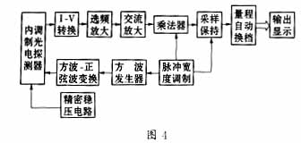 内调制微光检测系统的信号处理部分的基本原理如图4所示,主要由信号通道、参考脉冲、乘法器、采样保持电路、量程自动换档和精密稳压电路组成。