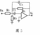 由上式可知,选频放大电路的频率函数为冲击脉冲,可以用窄带带通滤波器来实现,我们采用巴特沃兹(Butterworth)二阶带通滤波器,巴特沃兹二阶滤波器在通带内具有最平坦的频幅特性,能够很好地改善探测器输出信号的信噪比。二阶巴特沃兹滤波器的结构如图5所示。其中心角频率