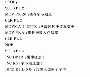 根据器件要求,需按数据区写入数据。先对写入数据进行组织,放入外部RAM中缓存,写入时,从缓冲区中读出256个字节,一次性写入AT29C020。写入一个数据区的程序如下: