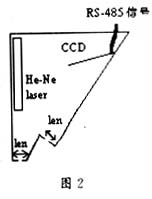 CCD线阵(1024个像素,间距14μm)及其驱动电路板探头内,该电路板上自带A/D转换、缓存器和RS485通讯口(传送数据的波特率为38.4Kbps)。RS485-RS232通讯转换模块及微机在监控室,数据传输线采用屏蔽电缆且屏蔽层接地,以消除外界干扰信号的串入。