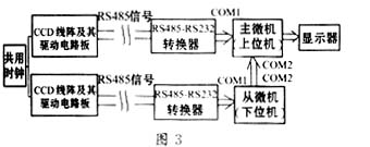 两块CCD采用同步时钟同时采样,上一路信号送主机,下一路信号送从机。从机对采集来的数据进行分析处理得到下位移x2,然后送主机。虽然从机功能简单,也要用奔腾机,要满足数据处理的高速度(与主机匹配)及采集和发送数据的高波特率;系统标定的参数由于热胀冷缩及不小心碰撞会发生变化,再次标定参数很方便,直接接上显示器调用标定参数子程序即可;微机的价格现在已很便宜。