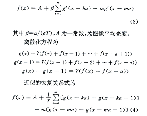 这是一个递推关系式,说明当前位置的恢复图像可以由离当前位置a处的恢复图像推算得出,模糊图像g(x)的导数总可以求得。只要求出长度为a的图像,整个图像都可以根据上述递推关系获得。