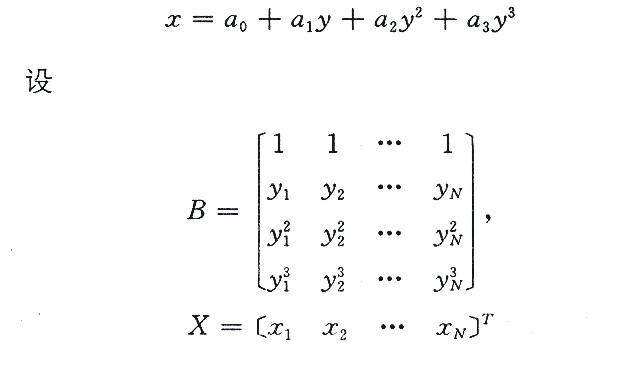 曲线拟合采用多项式的最小二乘法。对每一根毛杆,沿着Y方向选取N组坐标(Xi ,Yi),以X作为变量,Y为自变量选定曲线的方程为