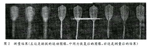 图像恢复的质量取决于恢复关系式中各参数的选取。A和γ对恢复图像的背景和对比有影响,而a对恢复图像的质量起决定作用。通常情况下采用搜索方法获得合适的值。在参考文献〔2〕中采用均方误差准则下实现自动搜索的方法。本文的测量环境下,由于运动速度恒定,参数a一旦确定后当作一个参数来处理。