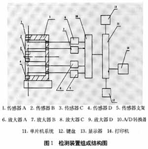 该检测装置组成结构如图l所示,在一个固定的支架上,在同一个竖轴方向安装4个相同电感位移传感器A、B、C、D,通过支架上的圆孔用导线接到一个控制盒中。在控制盒装有放大器、A/D转换器,单片机系统、微型打印机、显示器、键盘等。检测时把被测管材送入支架槽内,此时电感位移传感器输出信号通过放大器放大、A/D转换器转换后送入单片机系统,单片机系统采集到信号后经进行处理,显示及打印。