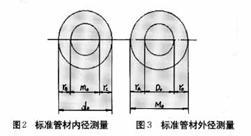 设标准管材的内径为d0,外径为D0,支架槽内圆柱直径为m0,支架槽内径为材M0,被测管材的内径为d,外径为D,将标准管材送入支架槽内对检测装置进行时,如图2、3所示,则标准管材内径:![]()