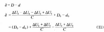由(9)、(10)式可以看出,只要把电感位移传感器在标准管材中位移量ΔU1、ΔU3,电感位移传感器在被测管材中的位移量ΔU2、ΔU4和标准管材的内径、外径就可由(9)、(10)计算出被测管材的内径和外径值。由(10)-(9)式得被测管材的壁厚: