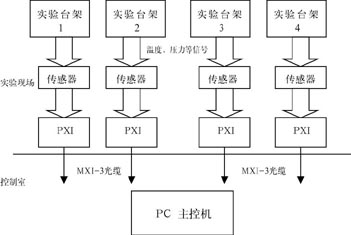 热工水力学实验大厅内有四个大型热工实验台架,每个台架都有大量的温度、压力、流量等热工参数,还有辅助的电压、电流、功率等信号。采用PXI和MXI技术,形成图2所示的测量系统。PXI系统靠近实验台架,通过MXI光缆将实验现场的PXI系统和控制室的PC主控机连接起来,所以大量的信号传输线都位于实验现场,虽然数量很多,但长度很短,这样既节约了大量费用,又有利于抗干扰。四个实验台架共用一套便携式PXI-MXI系统。实际应用证明,该系统配置合理、成本低、利用率高,大大地提高了实验水平和效率。