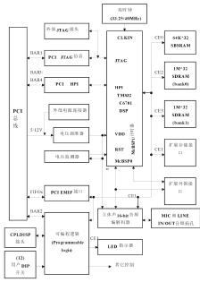 PCI总线接口,支持即插即用;通过HPI(Host Port Interface)访问DSP内存;16-bit音频编解码器,支持5.5kHz~48kHz采样率;三种DSP boot 模式:无自举模式,HPI 自举模式,ROM 自举 模式;256kB同步突发静态RAM (SBSRAM);8MB同步动态RAM (SDRAM)。