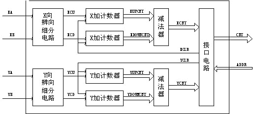 --- FPGA内部模块划分如图3所示:从X向光栅来的A、B两相方波信号XA,XB由X向辨向细分电路辨向细分后,输出两路脉冲信号XCU、XCD,16位计数模块分别对这两路脉冲信号进行计数,并将两计数值XUPCNT、XDOWNCNT相减,其差作为X向的16位位置数据XCNT。接口电路对3位地址信号ADDR译码,通过XCLR、YCLR对X、Y计数器分别清零,并选通X向或Y向位置数据输出到控制器。