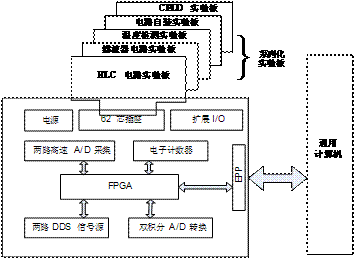 虚拟仪器的硬件系统的组成包含三个部分:(1)通用的个人计算机(PC),具有运行图形化编程软件的能力。(2)实验箱主板,具有数据采集、信号产生、定时计数、与计算机进行数据通信等多种功能。(3)多种实验电路板(插卡),如图1所示。此外,实验中根据需要可以再配备一些辅助仪器,如通用示波器、信号源等。
