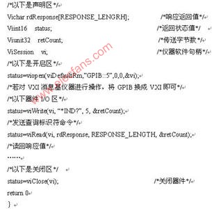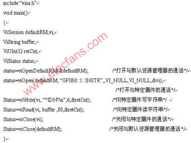 【实例4】对于用户来说,只需了解VISA函数的格式与参数就可以编写仪器的驱动程序,而不必关心VISA库与仪器如何沟通的细节。对VISA函数的调用一般可以分为声明、开启、器件I/O和关闭4部分,下面以一段简单的C语言程序为例进行说明。该程序是由计算机向一台GPIB器件发出“*IDN?”的IEEE-488.2公用命令,并从该器件回读其响应字符串。
