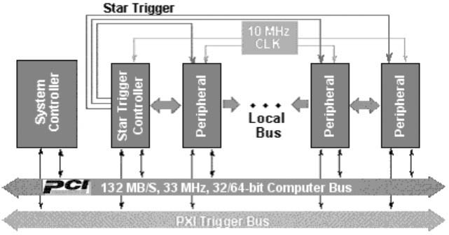 PXI 触发总线是由八个信号组成,各扩充槽皆连接至此总线,而透过PXI 触发总线,亦可达到同步的功能。但因为其总线之特性,所以时脉歪斜之精确度仅要求至小于10ns。利用PXI触发总线,可以于其上传输触发信号,甚或是数据撷取的时脉信号。 |