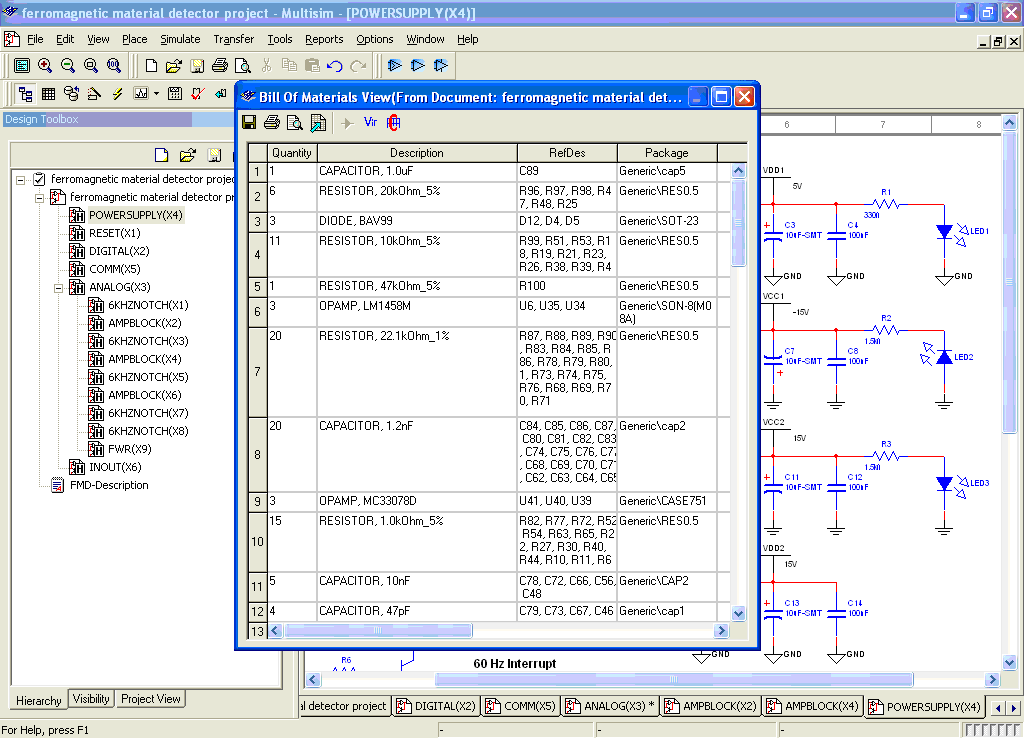 When using hierarchical blocks for modular design, the next requirement of the capture tool is to centrally manage all stages of the design, from schematics to datasheets, to proposal and design documents. This entails a project-based approach, and is advantageous to both to small simple designs and more complex and broad-reaching circuits. In the Multisim environment a project can be defined. Through this project all schematics, layout files and documents can be linked together. This organization creates a single project that binds the separate parts of a design into one entity, simplifying the management of all parts of the design process, particularly in team development. When collaboration extends among cubicles or continents, Multisim provides an organized way to effectively bring a design together.