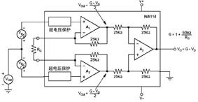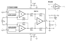 INA114两个输入端的保护各自可承受±40V电压。即使一个输入端电压为-40V,另一个为+40V,也不会有危险。每个输入端的内部电路在通常信号条件下提供串联小电阻。为提供等效的保护,串联输入电阻会产生过度噪声。如果输入端过载,保护电路把输入电流限制到安全值(约1.5mA)。即使没有电源电压存在,输入端仍然受到保护。