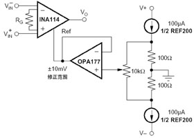 INA114用激光来修正微小的失调电压和漂移,在大多数应用中都不需要进行外部失调修正。图4所示为采用一个回路来修正输出偏离电压。在这个结点上必须使用低电阻来保证良好的共模抑制比,用一个运算放大器进行缓冲就可以达到这个目的。