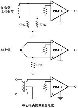 必须提供输入电流返回路径,INA114才能正常运行。图5所示为一些提供偏置电流返回路径的设计。没有偏置电流返回路径,输入的浮动将超出INA114的共模范围,放大器将达到饱和。如果差动信号源电阻很小,偏置电流路径可以接到一个引脚上(参看图5的热电偶)。信号源电阻大时,用两个相等电阻提供一个平衡输入,并且由于偏置电流和良好的共模抑制比,偏离电压也会变得较低。