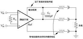 INA114的表面贴装版本有一个独立的输出检测反馈接口—引脚12,该引脚必须接引脚11来进行操作,在INA114的DIP版本中这个接口则设在芯片内部。
