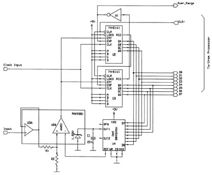 该电路所允许的最大时钟频率由计数器、DAC和比较器延迟时间的总和确定,本电路中总计延迟时间为:48ns + 500ns + 370ns = 918ns,允许选用任何频率低于1MHz的时钟。时钟频率的选择主要取决于输入信号的最大压摆率。反相器U1保证计数器数值达到FFH时停止计数,U1输出可用于输入信号超量程指示,微处理器也可以直接读取计数器数值FFH检测模拟输入是否超出满量程范围。来自微处理器的CLR信号用于峰值检测器的控制,当CLR为低电平时计数器被复位,CLR为高电平时峰值检测器处于正常工作状态。