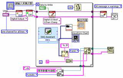 前面板相当于真实仪器可操作的面板,可以通过操作此面板来完成需要的任务,此前面板包括:开始运行按钮,数字I/O线控制按钮,通道选择,输入采集次数控制量,显示均值和图形显示几个控件。
