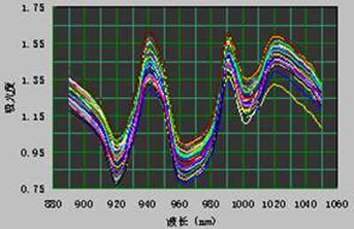 本系统扫描了40个已知粗蛋白含量的整粒小麦样品,得到40个光谱图数据(如图3)。