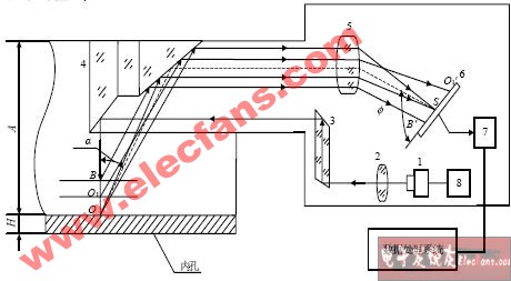应用光探针扫描被测件内径是单光三角测量原理实现非接触测量的基础[1-6]。单光三角方案测量原理框图如图1所示。图中,1为半导体激光器;2为发射光学系统;3为光束转向系统;4为反射分光棱镜;5为接收成像光学系统;6为光电位置传感器;7为信号处理系统;8为稳功率激光电源。