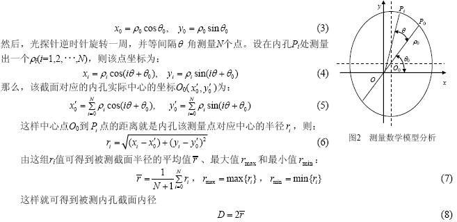 实际测量中,光探针回转中心与被测内孔实际中心不可能重合,为了消除光探针的几何中心位置偏离内孔中心对测量结果带来的误差,可以在同一截面内使光探针回转360°,等间隔测量多点,通过建立数学模型加以消除。为此以光探针回转中心为原点,建立如图2所示的测量数学模型。角度的测量采用绝对光电编码器,并取编码器的绝对零位对准所建坐标系x轴的正向,起始角度θ0可由光电编码器测出,而此时ρ0由光探针测出。测量点P0的坐标为:
