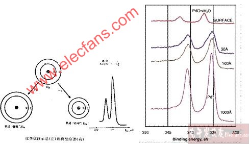 当元素处于化合物状态时,与纯元素相比,电子的结合能有一些小的变化,称为化学位移,表现在电子能谱曲线上就是谱峰发生少量平移。测量化学位移,可以了解原子的状态和化学键的情况。