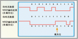 例如数据有6个连续的1,发送器就在第6个1后面填充或插入一个0(用一个切换来表示),这样就保证每7个位至少有一个转换,接收器检测到每6个连续1以后的任意位都会丢弃掉。随机数据的位填充开销仅为0.8%,即每125个数据位有1个填充位。