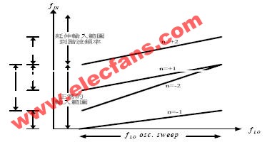 由式(2)得知,频谱分析仪的信号量测范围,无形中己被拓宽,低于或高于本地振荡器或其它谐波频率的输入信号,均能被混波产生中频。延伸输入信号频率的混波原理如图1.4 所示,其中纵轴代表输入信号(ƒIN),横轴代表本地振荡频率(ƒLO),图中的正负整数代表公式(2)中频放大器对应的正负号。