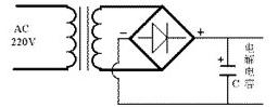 市电(AC220V或110V)经变压器后,再经桥式整流器,此时即成为脉动直流(暂不考虑电解电容C)。