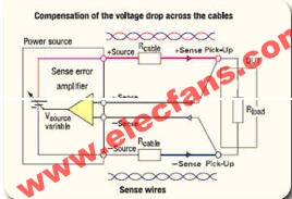 在一些输出为低电压、大电流的场合,电源的输出连接导线上形成的压降已不能忽略。如电源设定输出为3.3V/1A,假设输出线的电阻是0.3欧,就会在导线上形成0.3V的压降,那么实际到达的电压变为3.0V,这足以导致被供电的单元不能正常工作。类似于万用表测电阻时的四线测量法,我们需要对导线压降进行补偿。为此,可使用SENSE端子直接测量负载两端电压(如图4所示)。由于SENSE导线中的电流很小,因而产生的电压降可以忽略,即电源设备感应的电压实际上就是真正的负载电压,这样电源设备将提高自己的输出,使其等于导线压降和所需负载电压之和,从而实现对于导线压降的补偿,使负载真正获得所设定电压值。另外,有些电源加入了回读功能也是为了补偿导线本身电阻。