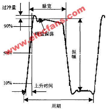 方波分析具有良好的突变性及周期性,通过观察设备对方波信号的输出信号波形能够很好的检测设备的各项性能,因此方波信号成为最常用的时域分析信号。图1是音频设备对方波的响应信号在半个周期(上升沿)内的具体描述。描述方波响应有上升时间、峰值振荡、过冲量及倾斜度等几个最主要参数。