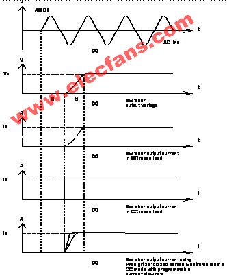 在从图(c)与(d)中,当电子负载为CC模式时,电源在t0到t1之间必须提供更多的输出功率。图(e)是使用海洋仪器推出的博计3310D系列电子负载于定电流模式时的负载电流,其启动负载电流斜率的大小可以由面板调整,同时电子负载的启动电压也可分别设定。