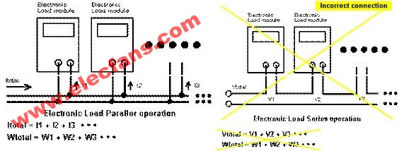 当需要测量的电流或功率超过电子负载模组规格时的连接方式:此时,两个或更多的负载模组可以并联起来增加其额定规格,即使不同规格的负载模组也可以并联起来使用,例如将3310A系列与3330A系列并联。一定要记住千万不要将电子负载串联使用。