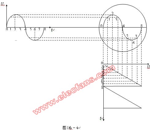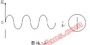 如果在竖直偏转板上(简称Y轴)加正弦电压,同时在水平偏转板上(简称X轴)加锯齿波电压,电子受竖直、水平两个方向的力的作用,电子的运动就是两相互垂直的运动的合成。当锯齿波电压比正弦电压变化周期稍大时,在荧光屏上将能显示出完整周期的所加正弦电压的波形图。如图16-4所示。