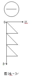 要能显示波形,必须同时在水平偏转板上加一扫描电压,使电子束的亮点沿水平方向拉开。这种扫描电压的特点是电压随时间成线性关系增加到最大值,最后突然回到最小,此后再重复地变化。这种扫描电压即前面所说的“锯齿波电压”,如图16-3所示。当只有锯齿波电压加在水平偏转板上时,如果频率足够高,则荧光屏上只显示一条水平亮线。